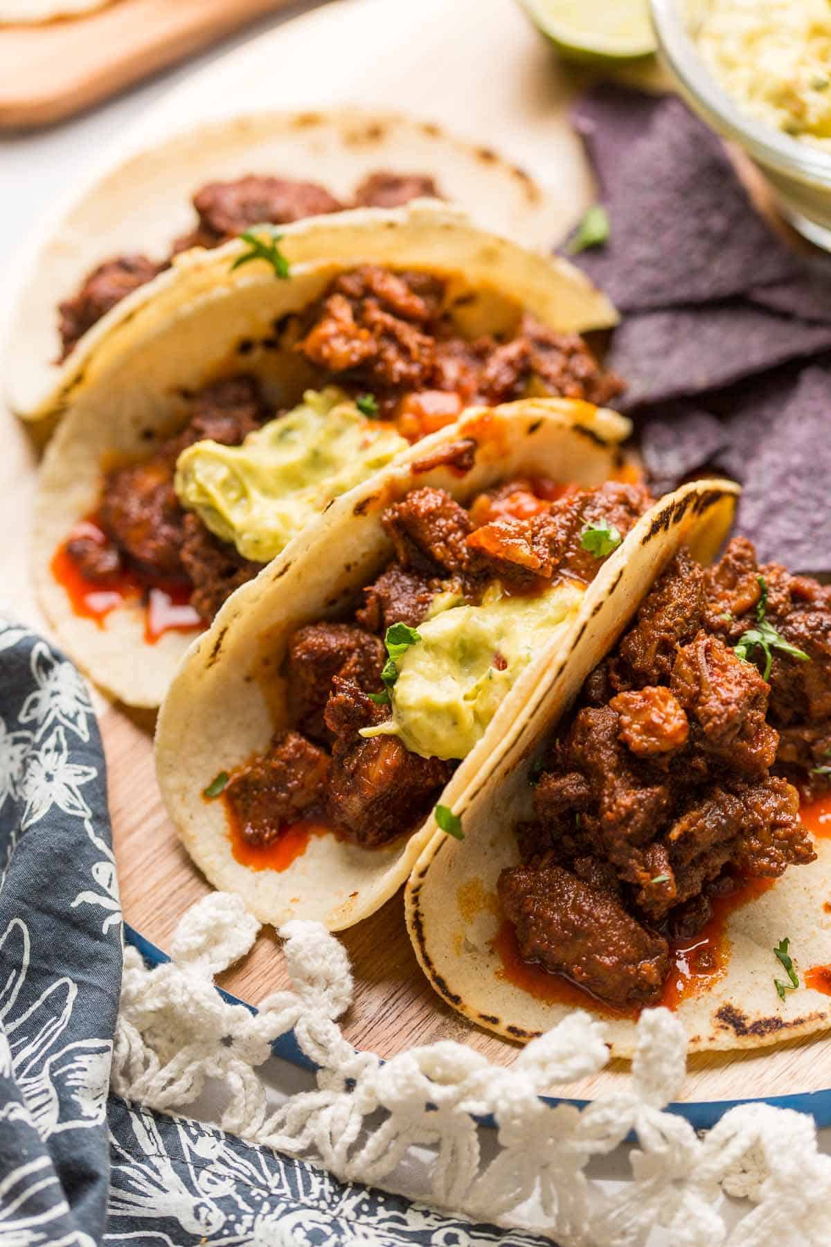 Tacos Al CarbónTacos al carbón, a staple of authentic Mexican cuisine, are a testament to the power of simple, high-quality ingredients. The name, which translates to "tacos over charcoal," speaks to their defining characteristic: the meat is grilled over an open flame, imparting a smoky, rich flavor that’s impossible to replicate. Unlike some other taco variations where the meat is stewed or pan-fried, the 'al carbón' method focuses on the pure, unadulterated taste of the protein, typically thinly sliced beef like flank steak or skirt steak.The preparation is straightforward yet precise. The beef is seasoned with little more than salt and pepper, allowing the natural flavor to shine. It’s then laid directly on the grill, where the high heat sears the exterior, locking in the juices and creating a beautiful char. This grilling process is quick, ensuring the meat remains tender and juicy on the inside.Once the meat is cooked, it’s thinly sliced or chopped and piled onto warm, soft corn tortillas. The magic of tacos al carbón lies in the toppings, which are served on the side, allowing each person to build their perfect taco. Common accompaniments include a generous scoop of fresh guacamole, pico de gallo, a sprinkle of cilantro and diced white onion, and a squeeze of lime. The final touch is a smoky, spicy salsa, which cuts through the richness of the meat.Every bite is a harmonious blend of textures and tastes: the slight crisp of the charred meat, the softness of the tortilla, the creamy guacamole, and the bright, zesty notes of the fresh toppings. Tacos al carbón are more than just a meal; they're an experience—a celebration of grilled meat in its purest, most delicious form.