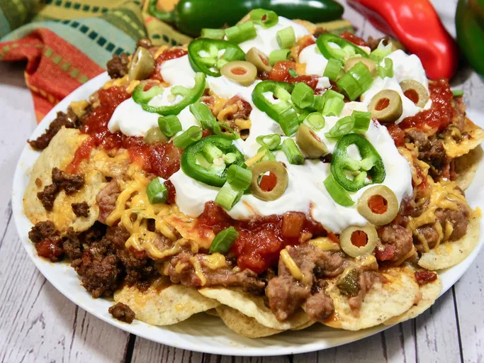 Smothered in a rich, velvety blanket of melted cheddar and Monterey Jack cheeses, these nachos boast a gooey, irresistible core. But the magic doesn’t stop there. We layer on seasoned ground beef, cooked to perfection with a hint of smoky spice, alongside vibrant diced tomatoes and slivers of fresh, zesty jalapeños for that perfect kick. A dollop of cool, creamy sour cream and a sprinkle of chopped green onions add a refreshing counterpoint, completing this culinary masterpiece.